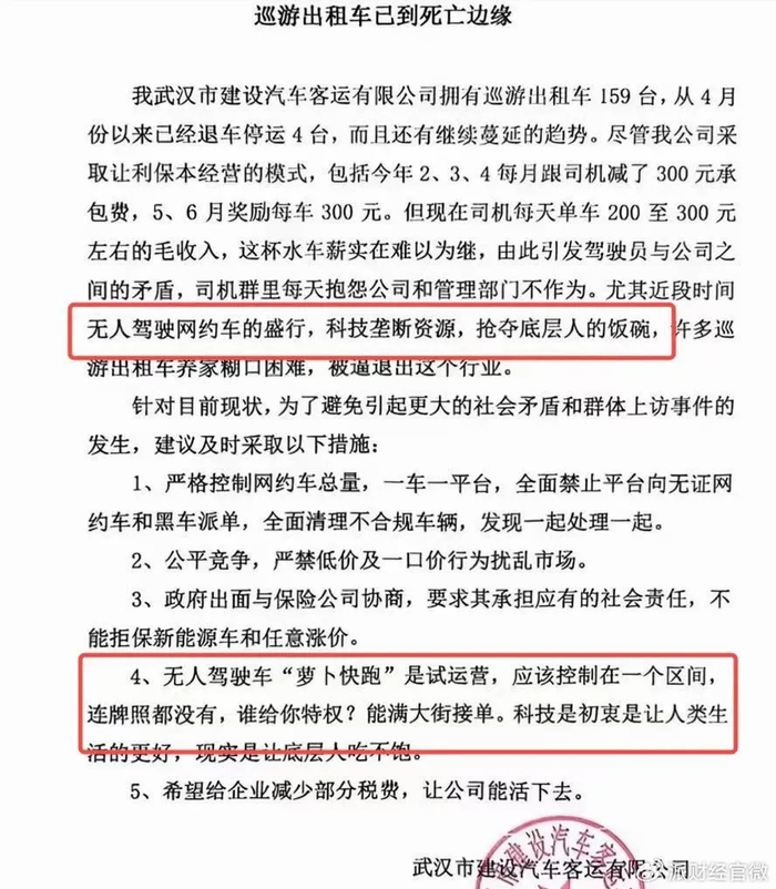 如此对比下,让不少司机产生了危机感。日前,一张以《巡游出租车已到死亡边缘》的网传图片,将这一话题的讨论度推至了巅峰。在这张落款为武汉市建设汽车客运有限公司的声明截图中,写道:“无人驾驶车萝卜快跑是试运营,应该控制在一个区间……科技的初衷是让人类生活的更好,现实是让底层人吃不饱。”