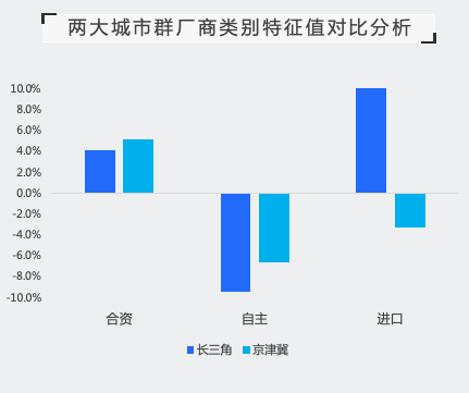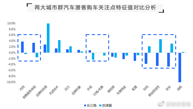 对比长三角与京津冀南北两大代表城市群,不同地域汽车潜客的购车标准差别明显:长三角更爱进口车,选车标准更重视外观内饰等视觉效果,而京津冀人群对驾乘体验的要求更高,如空间与舒适性。