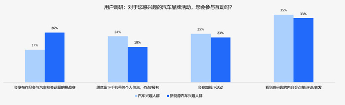 而新能源车主在短视频平台中更善于通过作品表达观点,更有意愿参与品牌共创类活动,更愿意直接发布自己的作品表达不同观点。