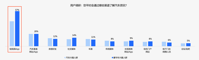 通过调研,我们也发现对比各个主流媒体、平台与场景,短视频平台是豪华车用户的重点汽车资讯渠道。