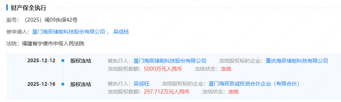 据公开信息披露,12月12日海辰储能部分子公司及创始人相关持股平台的股权已被司法冻结。
