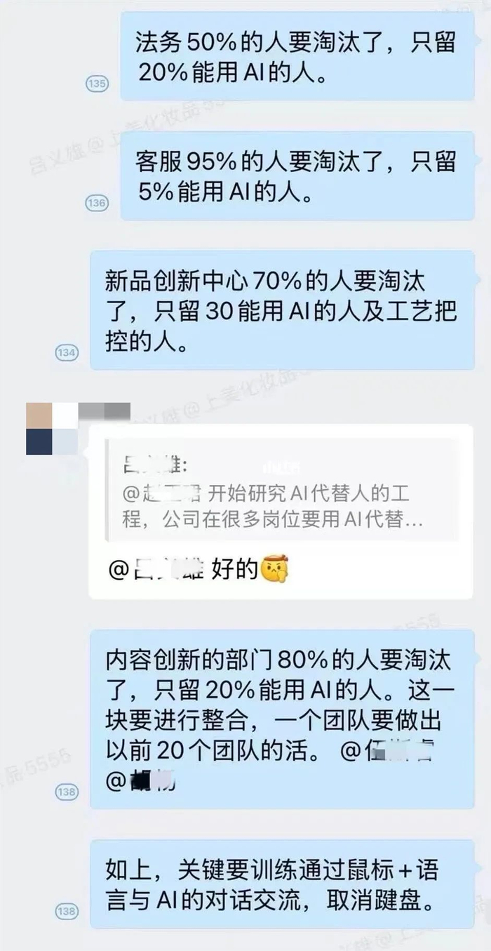· 新品创新中心70%的人要淘汰了,只留30(应为“30%”)能用AI的人及工艺把控的人。
