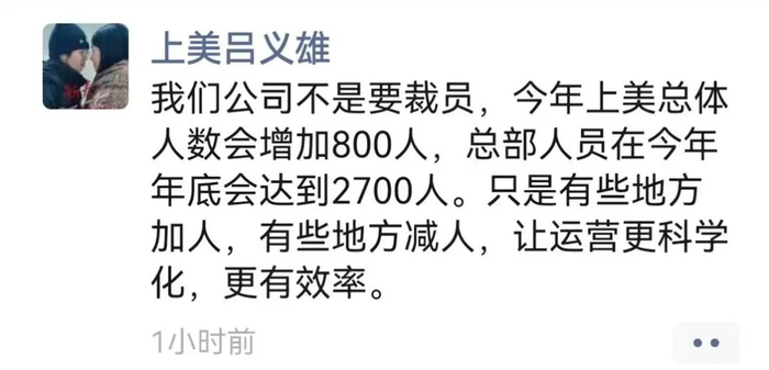 截图源自微信朋友圈“我们公司不是要裁员,今年上美总体人数会增加800人,总部人员在今年年底会达到2700人。只是有些地方加人,有些地方减人,让运营更科学化,更有效率。”网上流传的吕义雄朋友圈截图显示。
