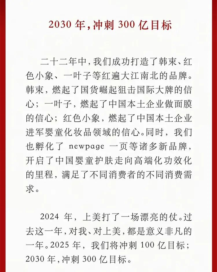 也或因此,在“致奋斗者 致创新者”的公开信中,吕义雄称“2024年,上美打了一场漂亮的仗”。同时,吕义雄还提出2025年冲刺100亿、2030年冲刺300亿的目标。