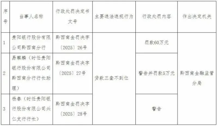 根据公开报道,2025年11月25日,贵阳银行黔西南分行因贷款“三查”不到位,被黔西南金融监管分局罚款60万元,成为该行近年来所收到的最大一笔罚款。