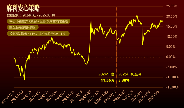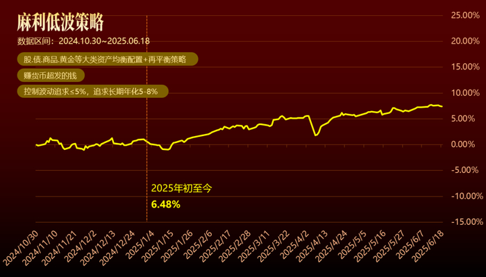 安心策略今年以来的表现还是符合预期的,截至25年6月18日2025年以来的收益率5.38%。从过程来看,虽然波动较大,但是组合的修复能力是在线的,年初和4月7号这种相对低谷上点仓位,持有体验大概率会去到8%以上。
