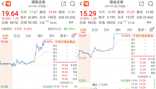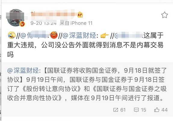 值得注意的是,周五(18日)两家券商均双双涨停;19日相关合并公告在各大社交媒体上流传,被网友质疑可能存在内幕交易的情况。
