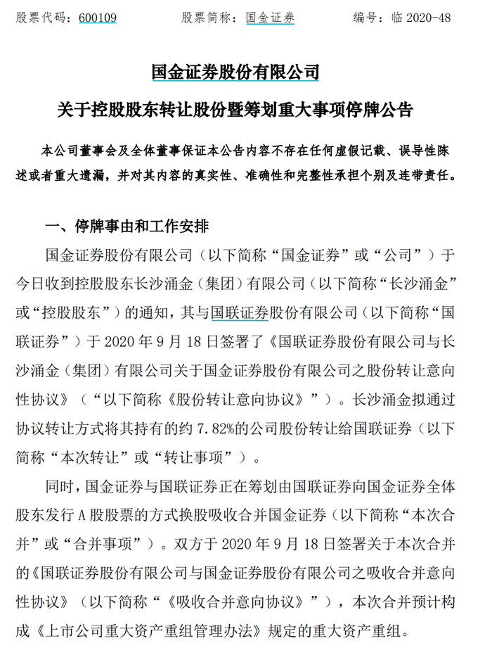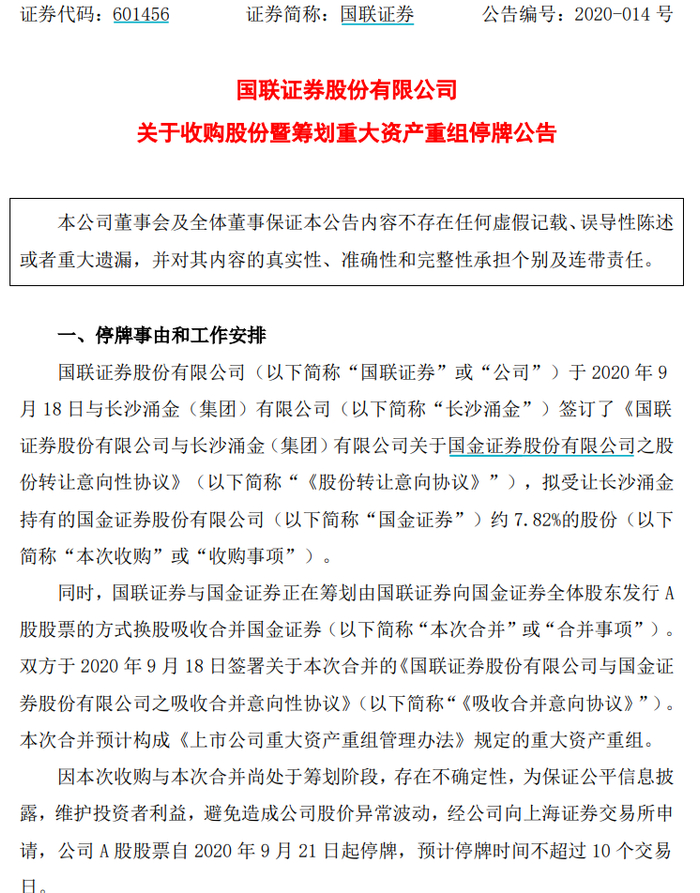 9月20日下午国联证券与国金证券发布停牌公告,国联证券将通过换股的方式吸收合并国金证券;与此同时国联证券收购长沙涌金持有国金证券约7.82%的股权。
