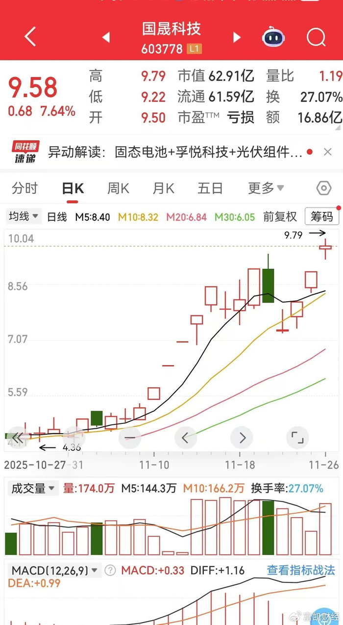 近期国晟科技的大涨或与其蹭上了固态电池等热点有关。10月14日晚间,国晟科技公告,公司二级控股子公司安徽国晟新能源拟以2.3亿元增资铁岭环球,后续由铁岭环球投资建设年产10GWh固态电池产业链AI智能制造项目。