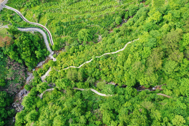 沿着蜿蜒曲折的小径漫步,两旁的树木郁郁葱葱,茂密的枝叶为行人撑起一片片绿色的天幕。脚下的青石板路干净整洁,似乎在诉说着历史的沉淀。不时有微风吹过,带来阵阵清凉,让人心旷神怡。