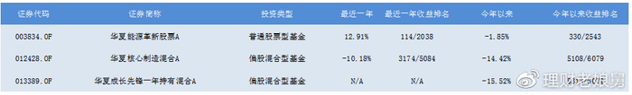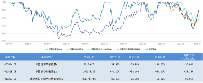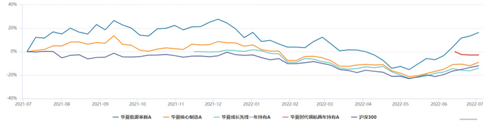 以代表基金华夏能源革新股票A为例,该基金仓位主要集中在新能源产业链上,其余三只产品并不是完全复制策略,例如华夏核心制造混合A持仓较为分散,有色金属、军工、医药都有涉及,华夏成长先锋一年持有混合A则持仓主要集中在金融和有色金属板块。从2021年四季度开始持仓较多的赛道股也发生回调,基金净值开始回落,但是由于在2021年积累了较多的收益,最近一年的收益为12.91%,排名仍然在前5%左右(114/2038),今年以来的收益为-1.85%,处于同类排名前10%左右的位置,特别是在4月底以来的这波以新能源为主线的反弹中,该基金已经接近回本,另外两只产品由于仓位较为分散,反弹力度并没有代表基金大。