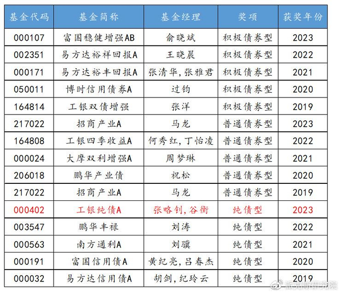 最近5年获奖的债券基金如下,这次只想给大家分享纯债基金,因此重点介绍获得最新纯债奖的工银纯债A。