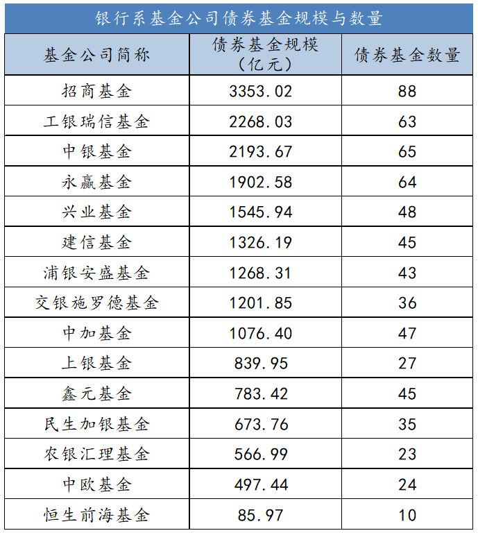 目前,银行系基金公司债券基金总规模为19583亿,占公募基金债券基金规模比为25.61%。