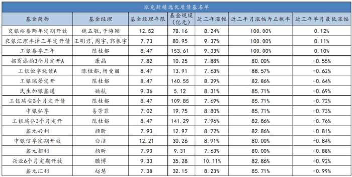 从各项指标综合来看,交银裕泰两年定期开放是近三年表现最好的债券基金。该基金近三年每月涨幅均为正,每月最低涨幅为0.12%,长期表现稳健。