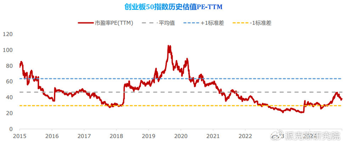 从创业板50的pe估值上看,目前的滚动市盈率还低于历史均值。