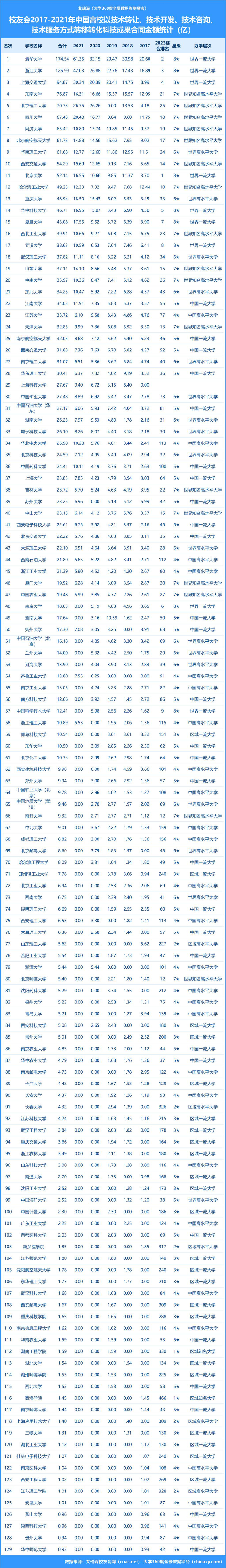 《中国科技成果转化年度报告(高等院校与科研院所篇)》由中国科技评估与成果管理研究会、科技部科技评估中心和中国科学技术信息研究所共同编著。在报告公布的中国高校科技成果转化金额统计数据中,以转让、许可、作价投资方式转化科技成果的合同金额,科技成果转化奖励个人现金和股份总金额,以技术转让、技术开发、技术咨询、技术服务方式转移转化科技成果合同金额,可在一定程度上反映科技成果的价值。