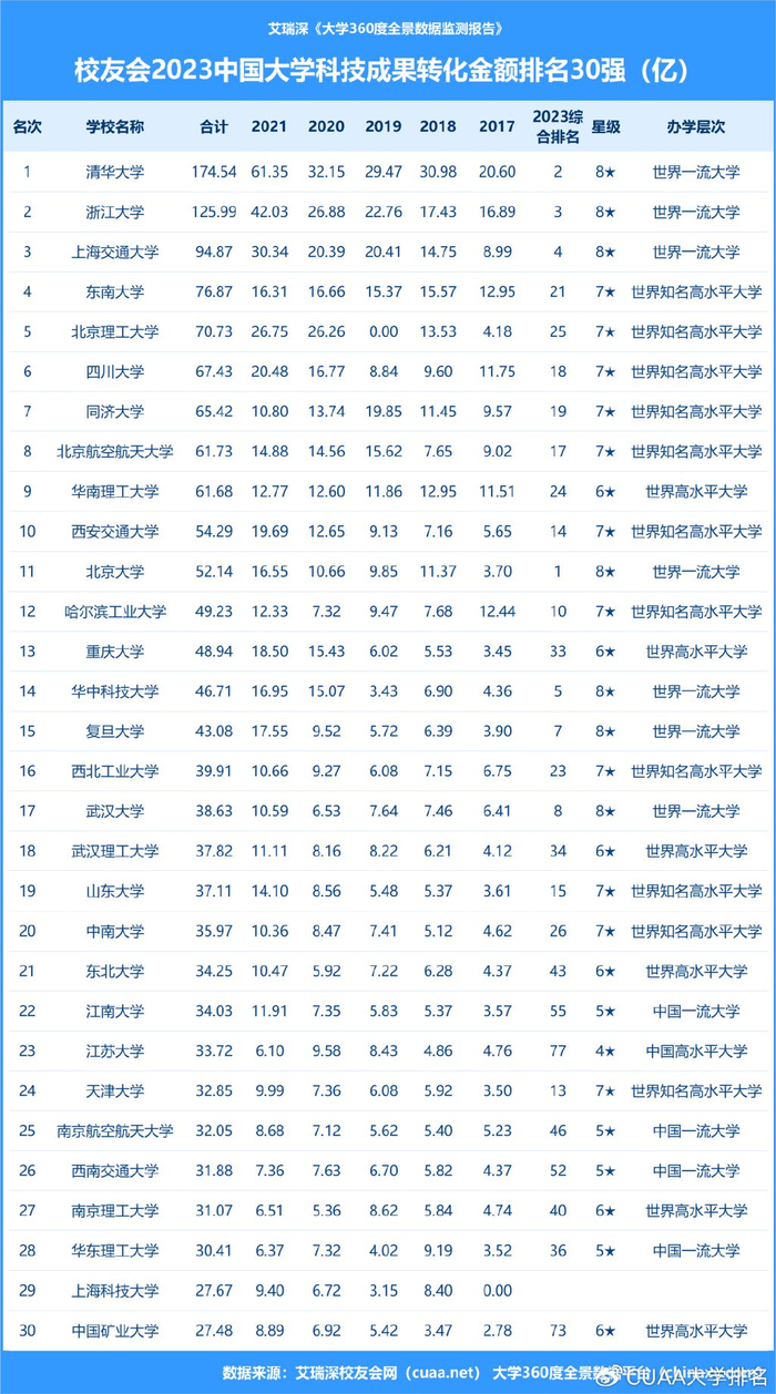 清华大学、浙江大学、上海交通大学雄居2023中国大学科技成果转化金额排名前三甲