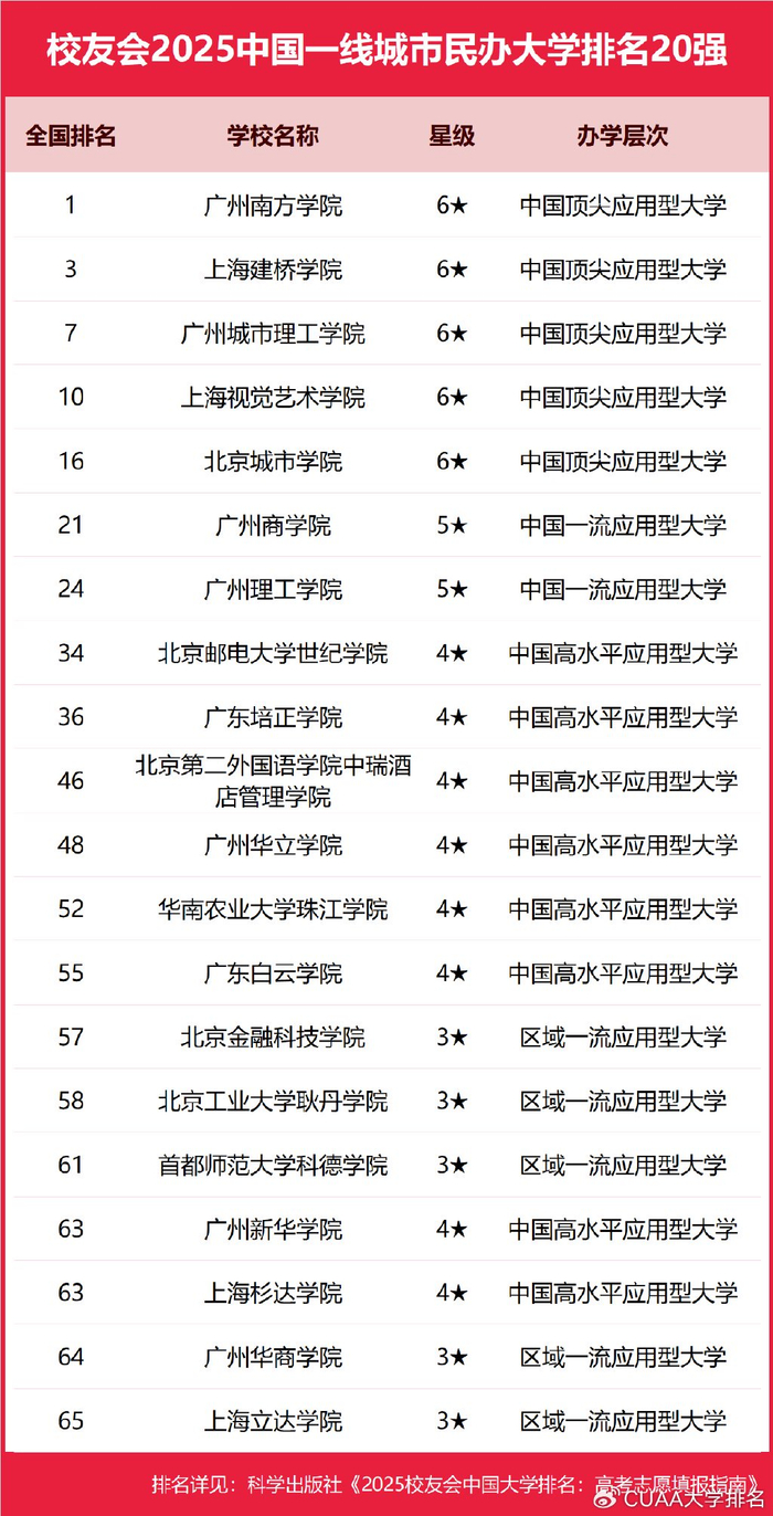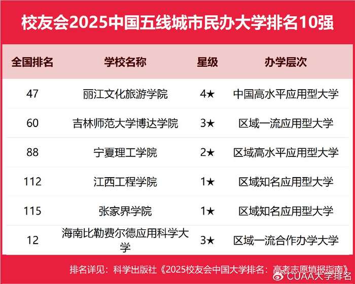 在校友会2025中国各线城市民办大学排名中,广州南方学院、武昌首义学院、西安欧亚学院、昆明城市学院、三亚学院、四川大学锦江学院、丽江文化旅游学院分列校友会2025中国一线城市、新一线城市、二线城市、三线城市、四线城市和五线城市民办大学排名第一。