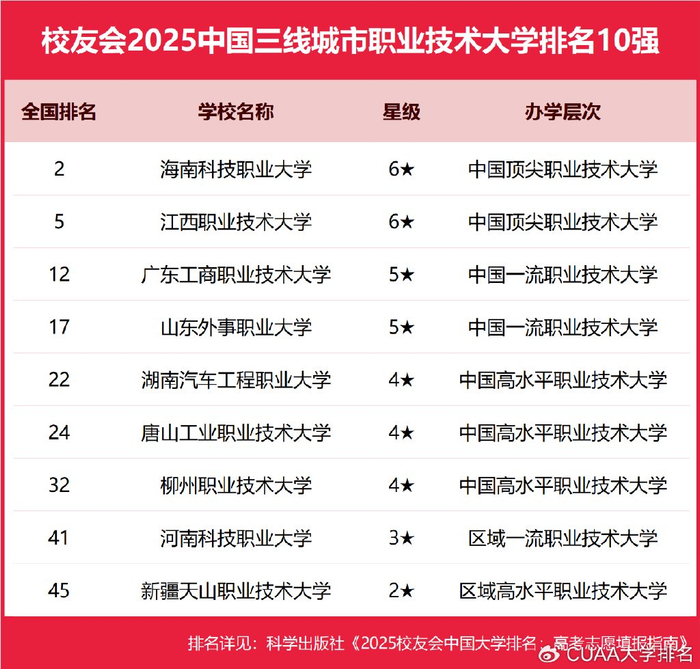 江西新能源科技职业学院、贵州工商职业学院、江西泰豪动漫职业学院、洛阳科技职业学院雄居2025年中国民办高职院校排名前三甲。海南科技职业大学、西安汽车职业大学和广东工商职业技术大学雄居2025年中国民办职业技术大学排名前三甲。