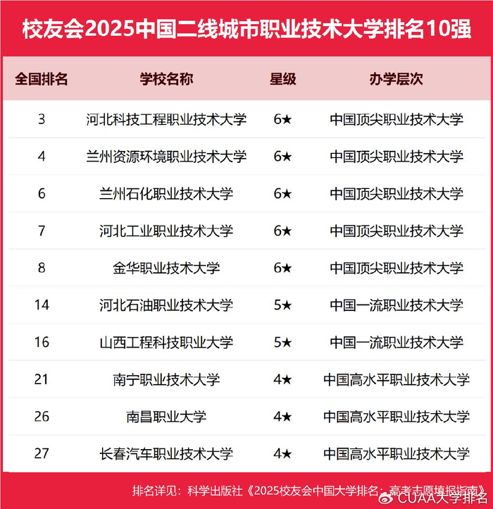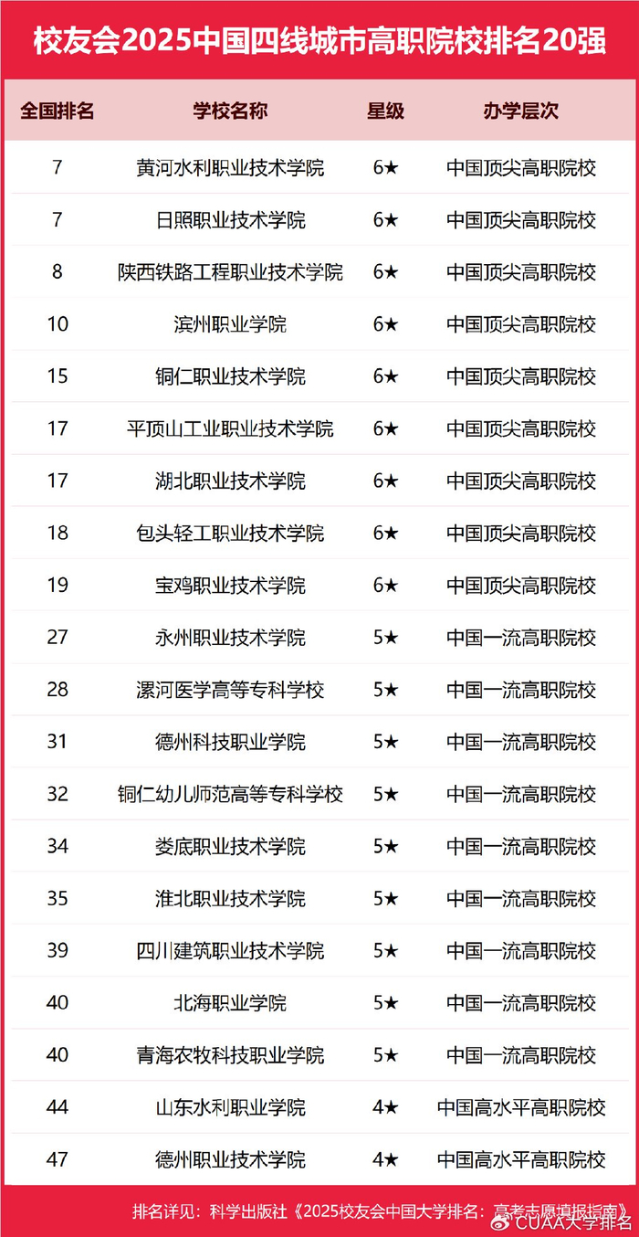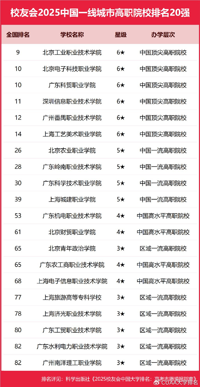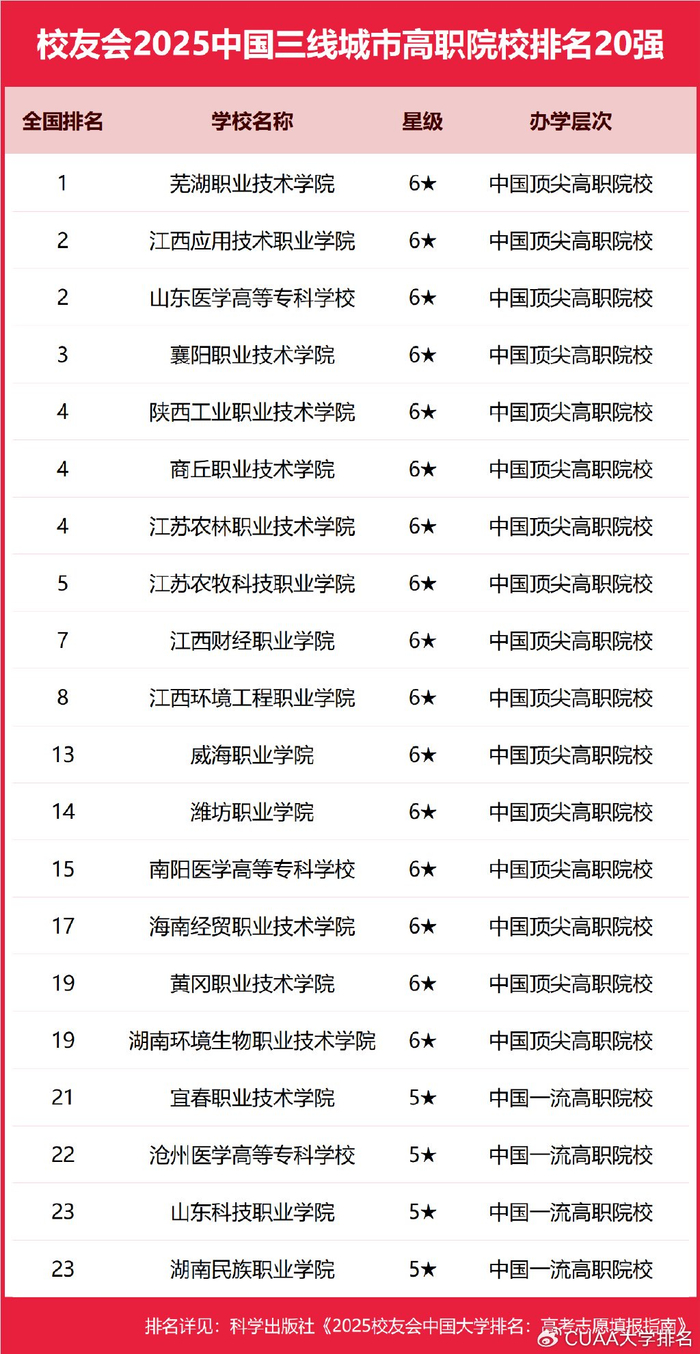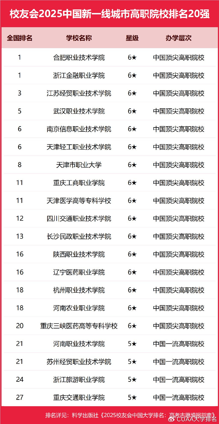 在校友会2025中国各线城市高职院校排名中,北京工业职业技术学院、合肥职业技术学院、浙江金融职业学院、宁波职业技术学院、芜湖职业技术学院、黄河水利职业技术学院、日照职业技术学院、江西新能源科技职业学院分列校友会2025中国一线城市、新一线城市、二线城市、三线城市、四线城市和五线城市高职院校排名第一。