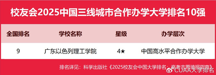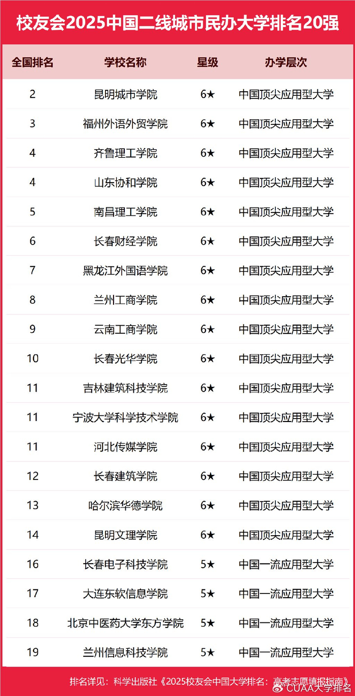 2025年1月6日,全国第三方评价机构艾瑞深校友会网(Cuaa.net) 最新公布校友会2025中国大学排名、2025中国各线城市大学排名、2025中国各线城市民办大学排名、2025中国各线城市合作办学大学排名、2025中国各线城市职业技术大学排名、2025中国各线城市高职院校排名。