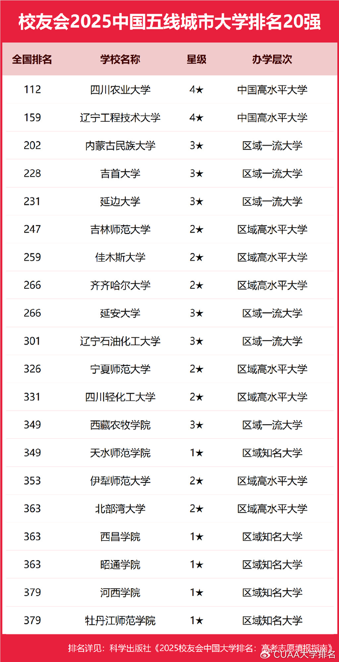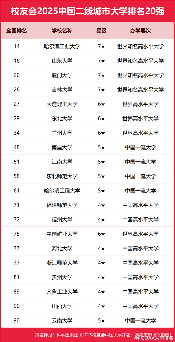 校友会2025中国各线城市大学排名依据《第一财经周刊》中国城市商业魅力排行榜的中国城市分级排名结果统计得出。该榜对中国地级以上城市按照商业资源集聚度、城市枢纽性、城市人活跃度、生活方式多样性、E未来可塑性等五大指标进行评价,将中国城市划分为一线城市、新一线城市、二线城市、三线城市、四线城市和五线城市等5个等级。