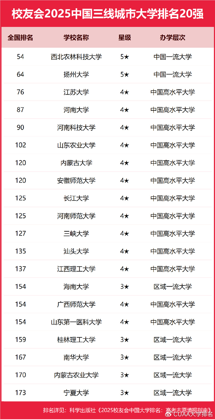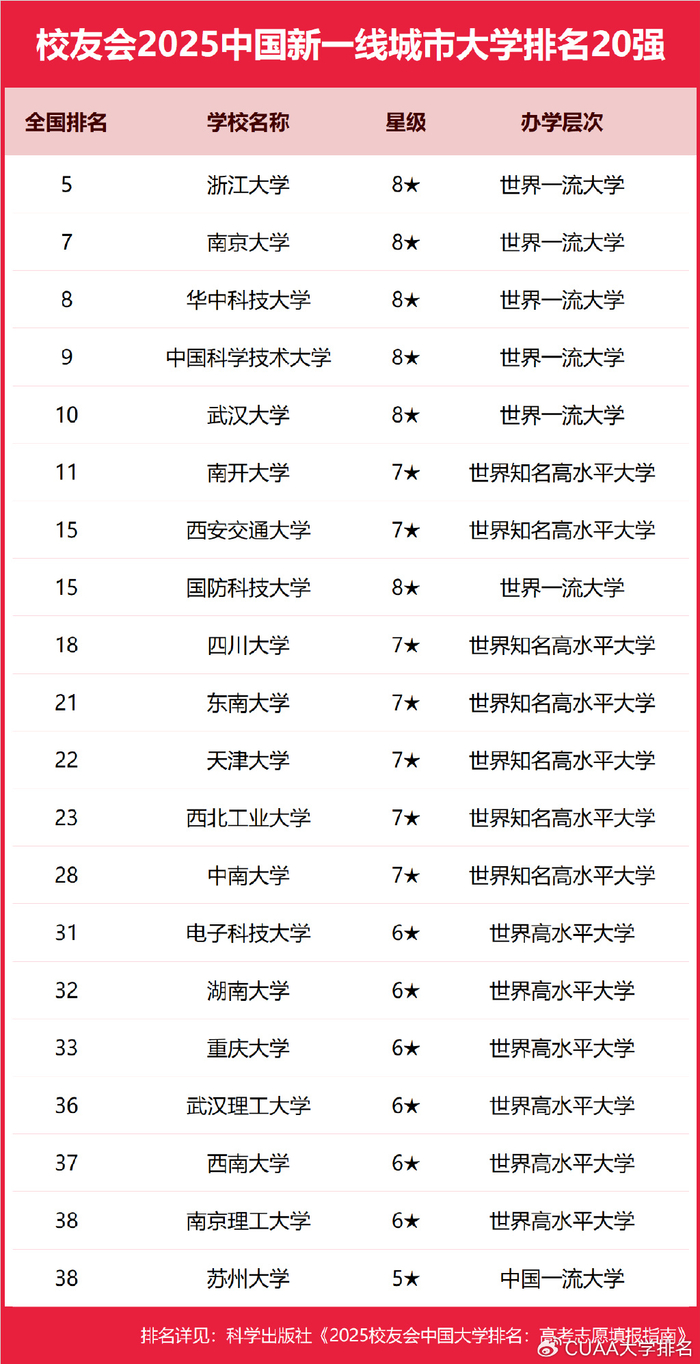 哪些高校是2025年中国一线、新一线、二线、三线、四线和五线城市办学实力最强的大学?