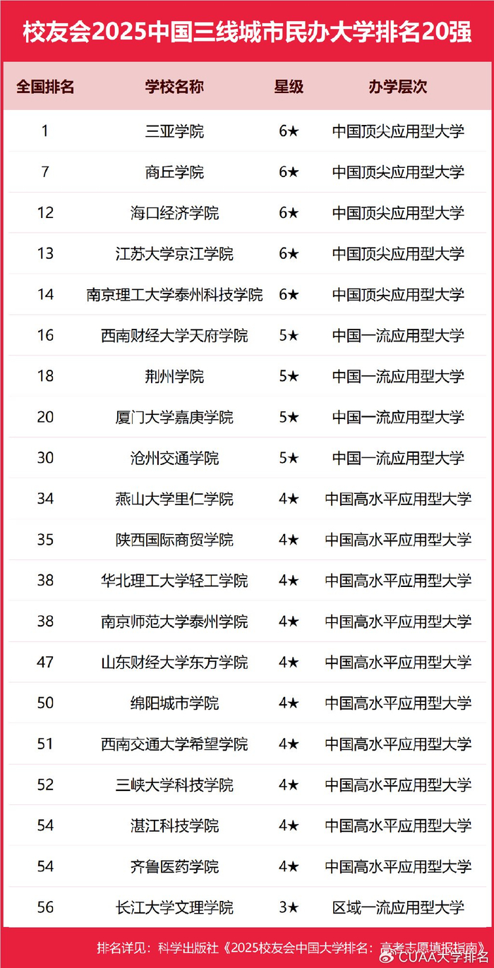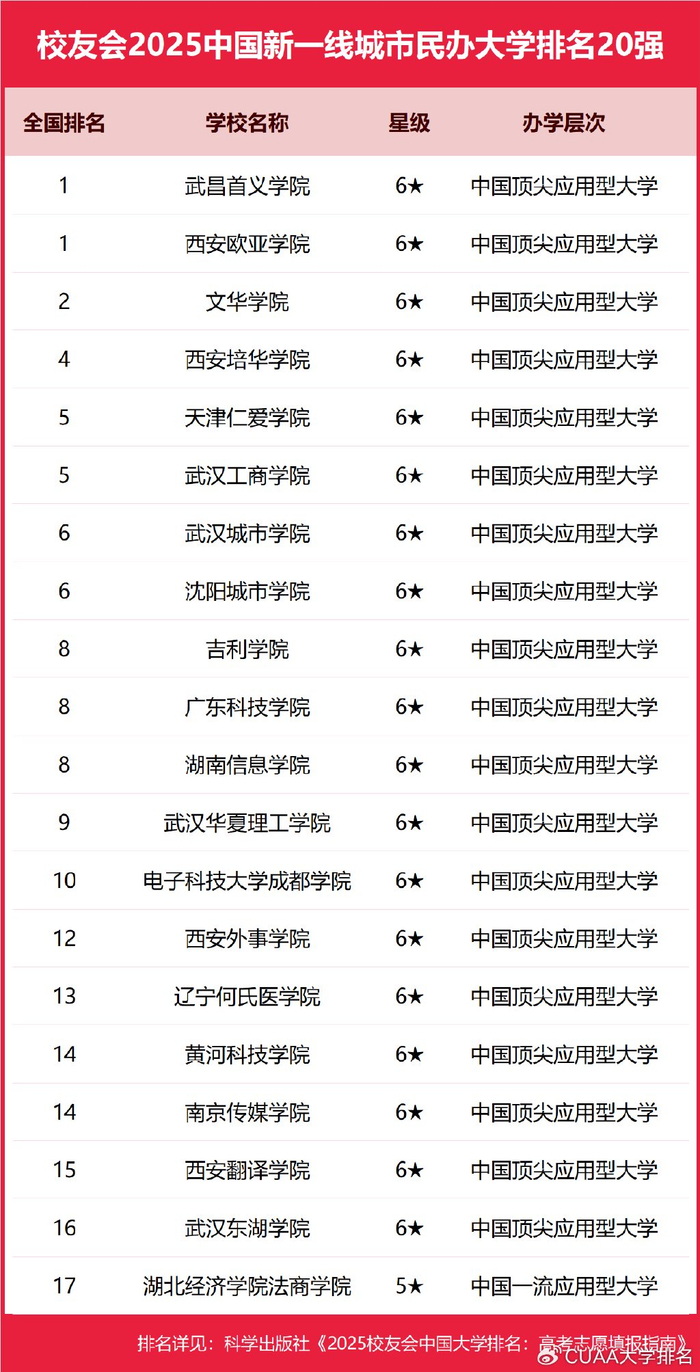 武昌首义学院、三亚学院、西安欧亚学院、广州南方学院名列2025中国民办大学排名第一。四川大学锦江学院、电子科技大学成都学院、宁波大学科学技术学院、江苏大学京江学院、南京理工大学泰州科技学院雄居2025年中国独立学院排名前五强。