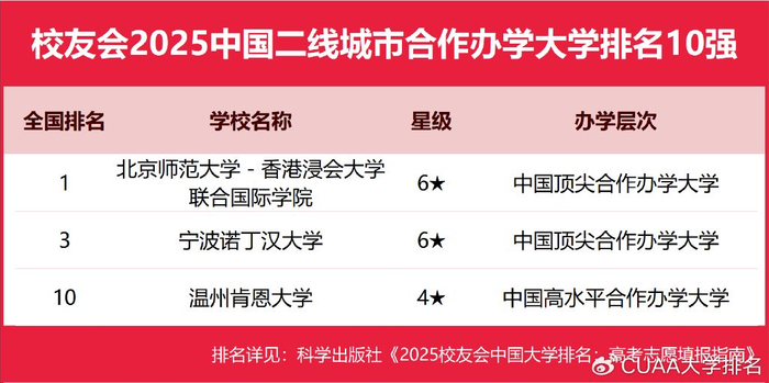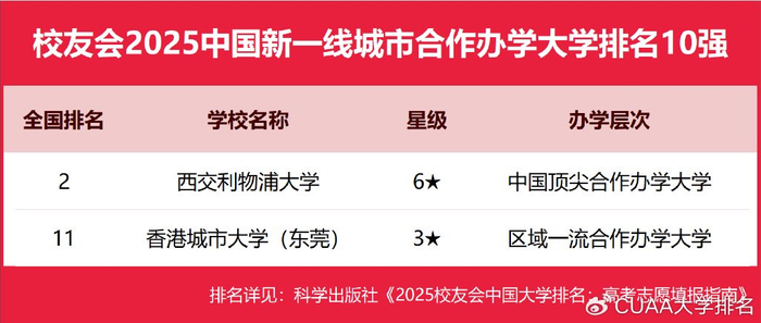 在校友会2025中国各线城市合作办学大学排名中,香港中文大学(深圳)、西交利物浦大学、北京师范大学-香港浸会大学联合国际学院、广东以色列理工学院、海南比勒费尔德应用科学大学分列校友会2025中国一线城市、新一线城市、二线城市、三线城市、四线城市和五线城市合作办学大学排名第一。