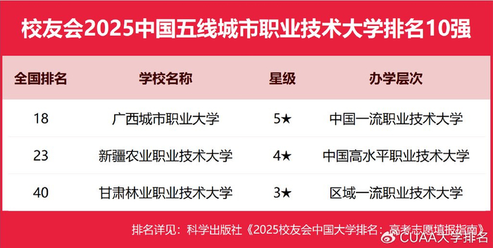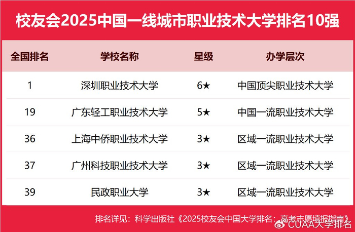 在校友会2025中国各线城市职业技术大学排名中,深圳职业技术大学、西安汽车职业大学、河北科技工程职业技术大学、海南科技职业大学、山东外国语职业技术大学、广西城市职业大学分列校友会2025中国一线城市、新一线城市、二线城市、三线城市、四线城市和五线城市职业技术大排名第一。