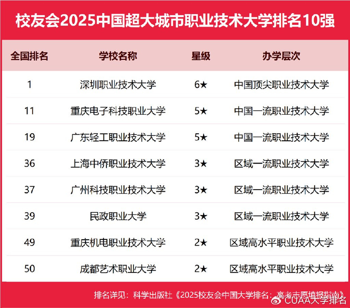 在校友会2025中国职业技术大学排名中,深圳职业技术大学、重庆电子科技职业大学、广东轻工职业技术大学、上海中侨职业技术大学、广州科技职业技术大学、民政职业大学、重庆机电职业技术大学、成都艺术职业大学位列2025中国超大城市职业技术大学排名前十强。