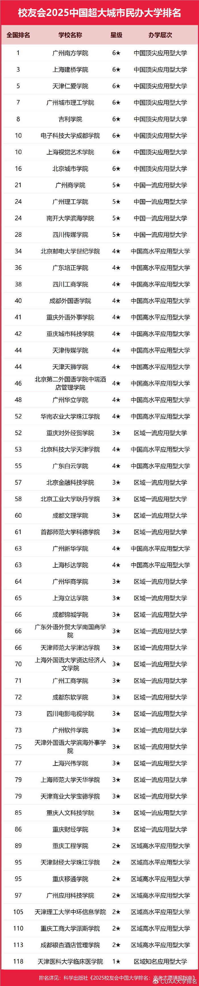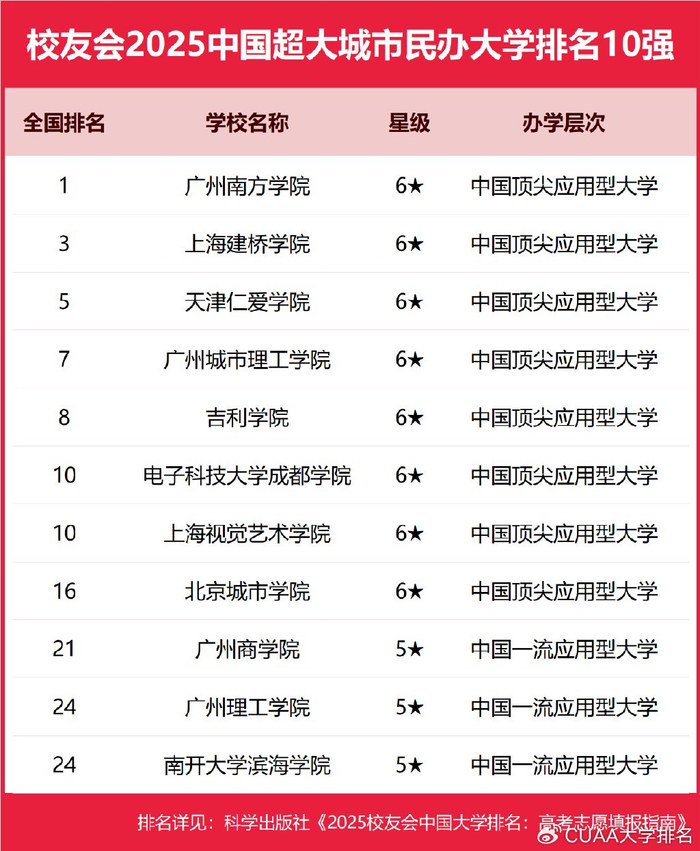 在校友会2025中国民办大学排名中, 广州南方学院、上海建桥学院、天津仁爱学院、广州城市理工学院、吉利学院、电子科技大学成都学院、上海视觉艺术学院、北京城市学院、广州商学院、广州理工学院位列2025中国超大城市民办大学排名前十强。