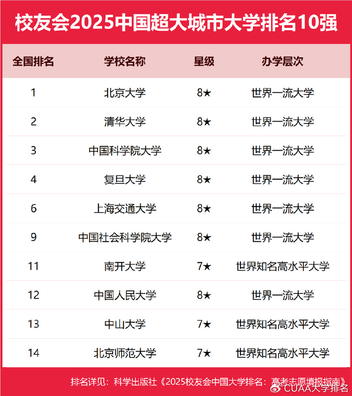 北京大学、清华大学位居2025中国超大城市大学排名冠亚军,上海交通大学前五