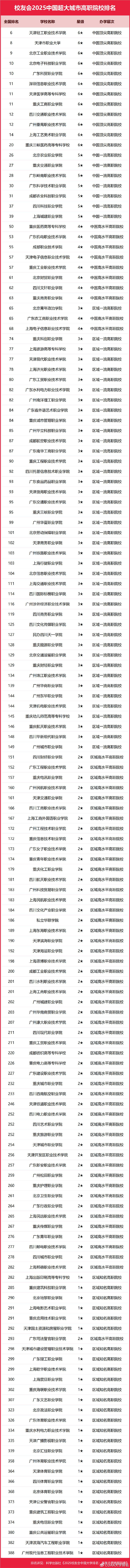 在校友会2025中国高职院校排名中, 天津轻工职业技术学院、天津市职业大学、北京工业职业技术学院、北京电子科技职业学院、广东科贸职业学院、深圳信息职业技术学院、天津医学高等专科学校、重庆工商职业学院、四川交通职业技术学院、广州番禺职业技术学院、位列2025中国超大城市高职院校排名前十强。