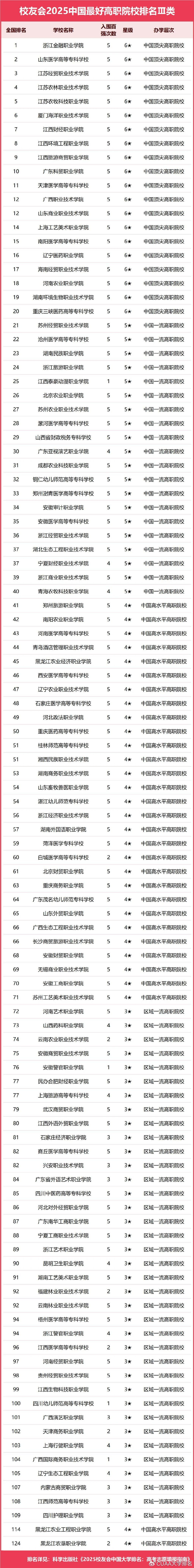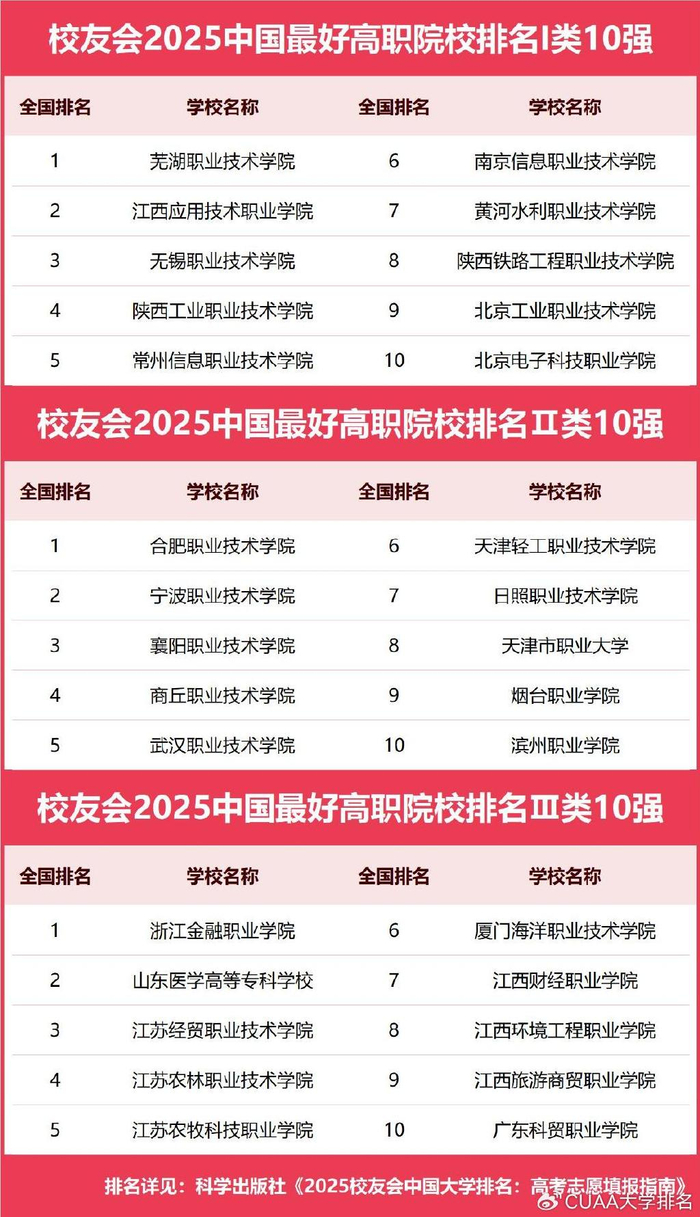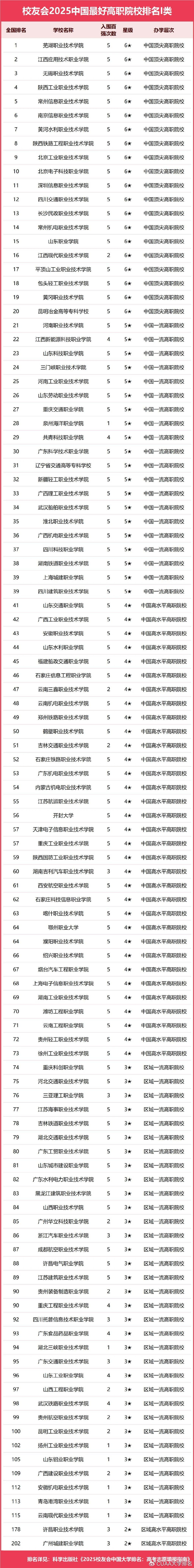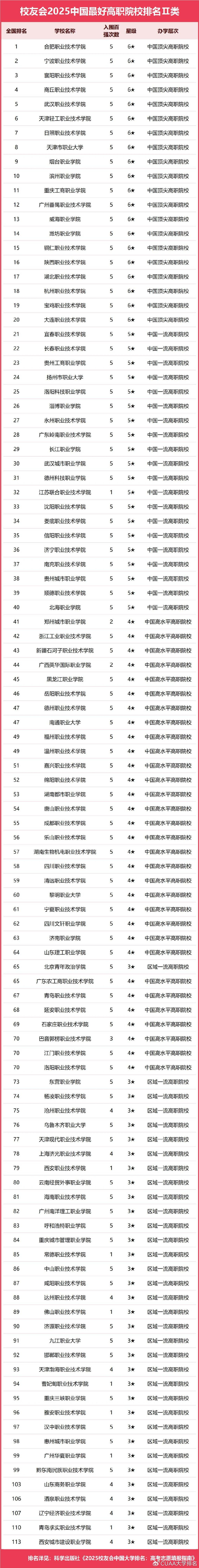 在校友会 2025 中国最好高职院校排名中,芜湖职业技术学院、江西应用技术职业学院和无锡职业技术学院雄居2025中国最好高职院校排名I类前3强。合肥职业技术学院、宁波职业技术学院和襄阳职业技术学院雄居2025中国最好高职院校排名Ⅱ类前3强。浙江金融职业学院、山东医学高等专科学校和江苏经贸职业技术学院雄居2025中国最好高职院校排名Ⅲ类前3强。