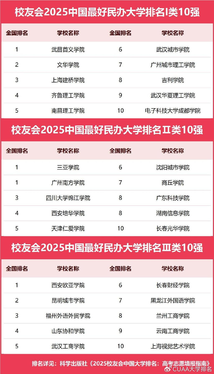 武昌首义学院、三亚学院和、西安欧亚学院和广州南方学院雄居2025中国最好民办大学排名冠军