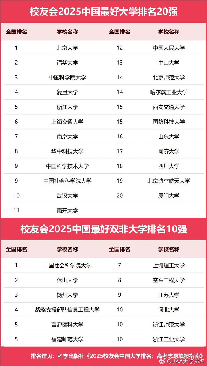 2025年全国高考即将来临,为了给全国考生比较分析2003-2025年全国百强高校的综合排名变化情况提供权威参考,2025年4月,全国第三方大学评价机构艾瑞深校友会网(Cuaa.net)公布校友会2025中国最好大学排名、2025中国最好民办大学排名、2025中国最好职业技术大学排名和2025中国最好高职院校排名。全部排名结果收录于科学出版社出版发行的《2025校友会中国大学排名:高考志愿填报指南》一书。