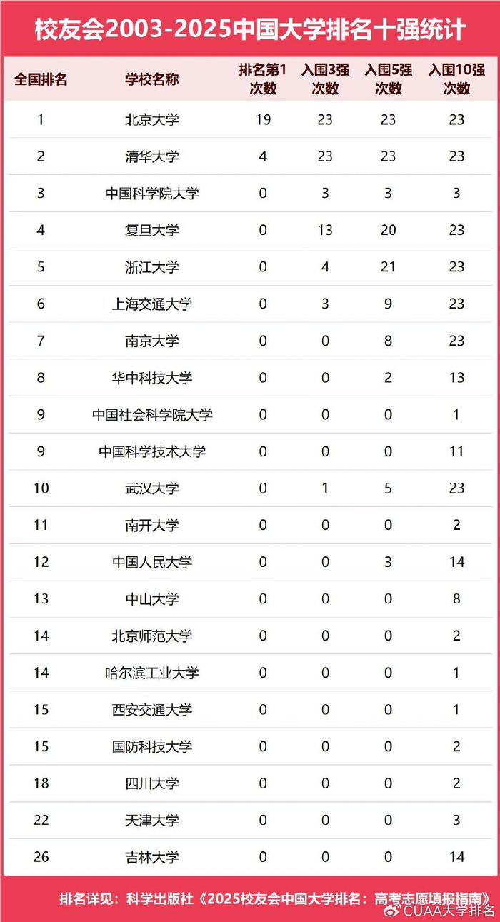 榜单显示,在2003-2025校友会中国大学排名中,北京大学表现最好,连续19年问鼎中国大学排名榜首,清华大学4次赢得中国冠军,两校雄居校友会2025中国最好大学排名冠亚军。复旦大学、浙江大学、上海交通大学、南京大学、武汉大学等7所大学连续23年跻身全国十强。中国社会科学院大学、燕山大学、扬州大学、战略支援部队信息工程大学、首都医科大学、福建师范大学问鼎2025中国最好双非大学排名前五强。