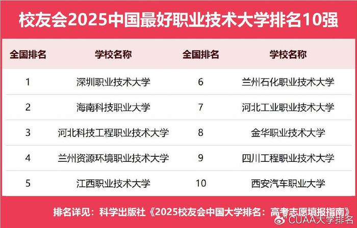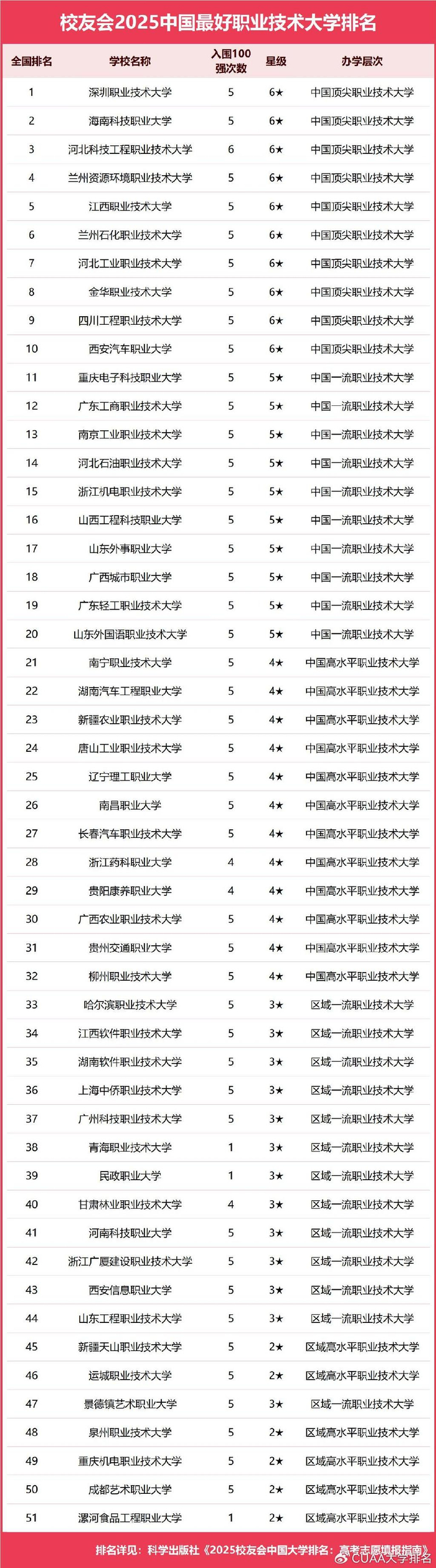 深圳职业技术大学、海南科技职业大学和河北科技工程职业技术大学雄居2025中国最好职业技术大学排名前3强。