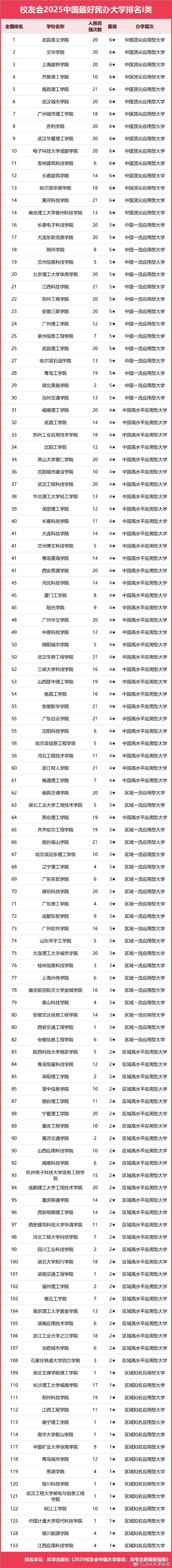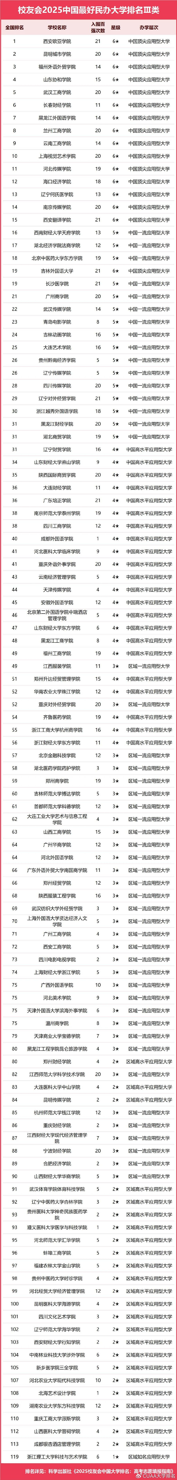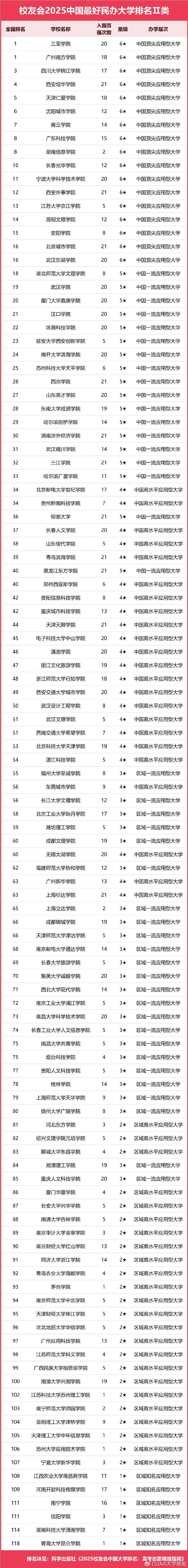 在校友会2025 中国最好民办大学排名中,武昌首义学院、文华学院和上海建桥学院雄居校友会2025中国最好民办大学排名I类前3强。三亚学院、广州南方学院和四川大学锦江学院雄居2025中国最好民办大学排名Ⅱ类前3强。西安欧亚学院、昆明城市学院和福州外语外贸学院雄居2025中国最好民办大学排名Ⅲ类前3强。