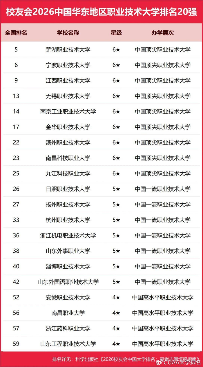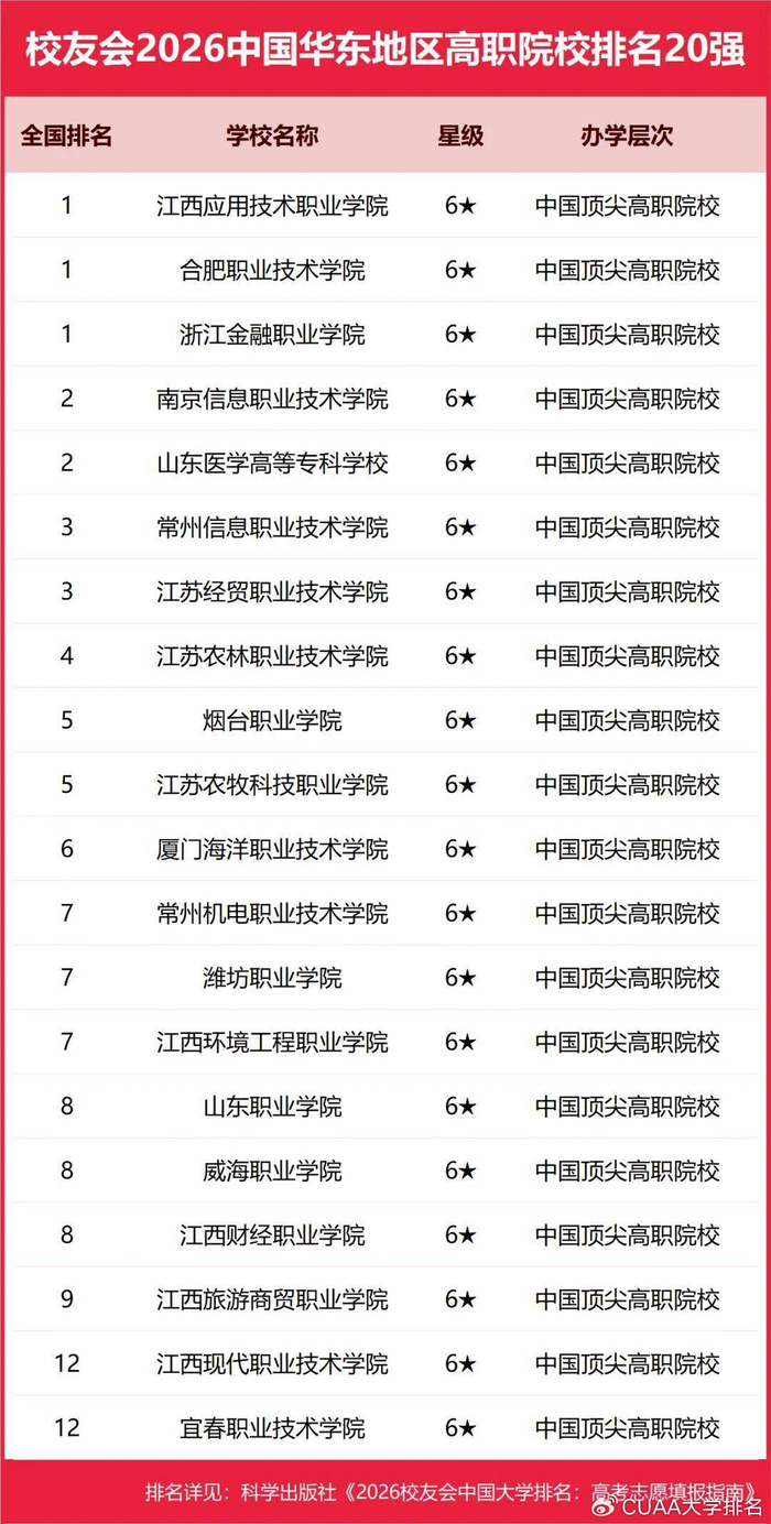 江西应用技术职业学院、合肥职业技术学院、浙江金融职业学院2026中国华东地区高职院校排名并列冠军