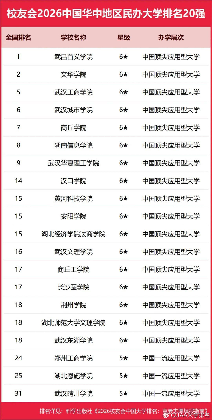 武昌首义学院、文华学院、上海建桥学院和齐鲁理工学院位列校友会2026中国民办大学排名I类前3强。三亚学院、广州南方学院与四川大学锦江学院位列校友会2026中国民办大学排名Ⅱ类前3强。西安欧亚学院、昆明城市学院、福州外语外贸学院与山东协和学院位列校友会2026中国民办大学排名Ⅲ类前3强。
