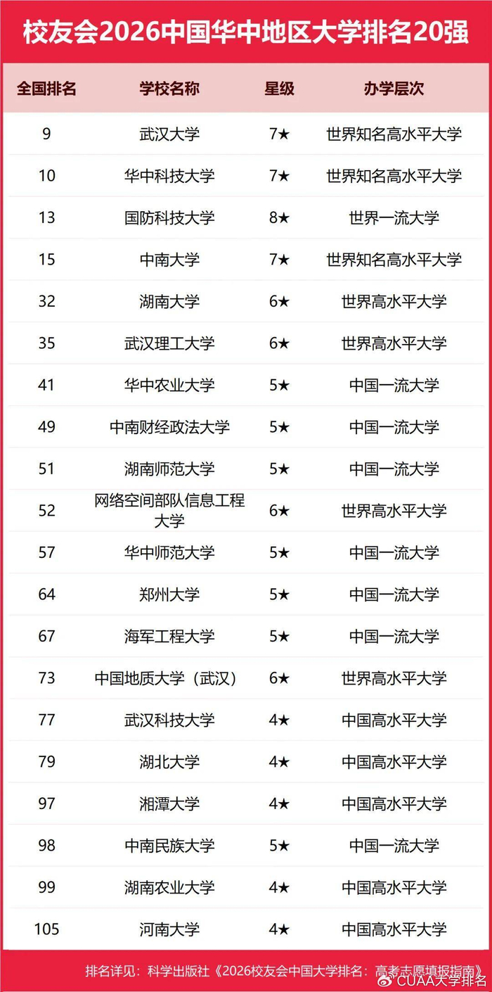 武汉大学问鼎校友会2026中国华中地区大学排名首位