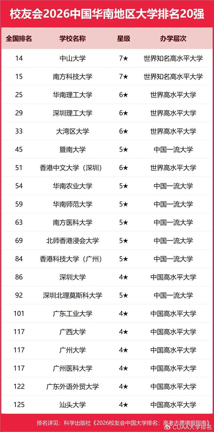中山大学问鼎校友会2026中国华南地区大学排名首位
