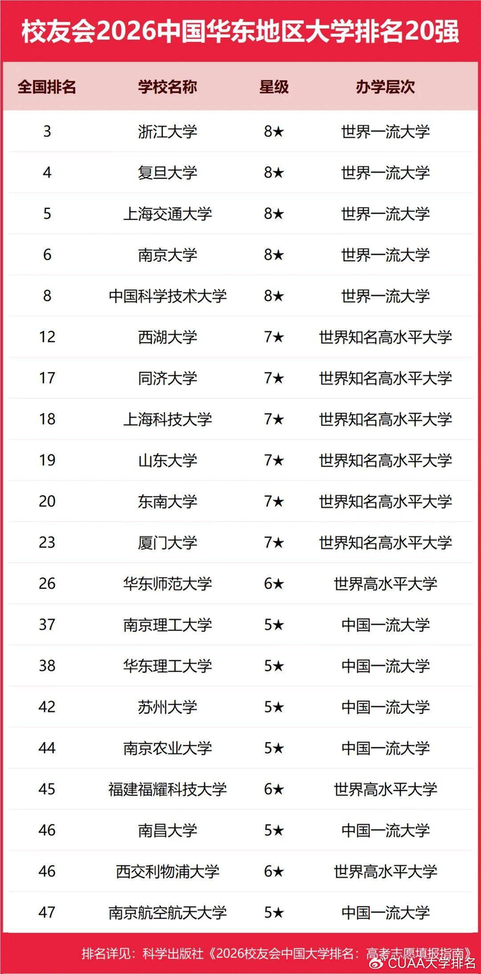 浙江大学问鼎校友会2026中国华东地区大学排名首位