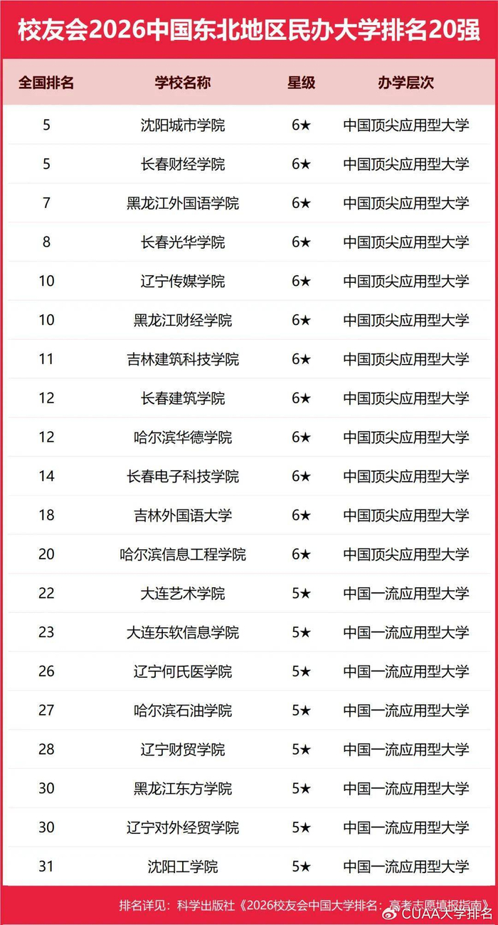 沈阳城市学院、长春财经学院并列2026中国东北地区民办大学排名第一