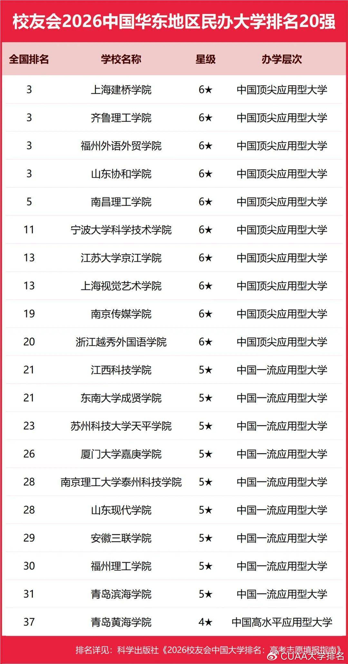 上海建桥学院、齐鲁理工学院、福州外语外贸学院、山东协和学院2026中国华东地区民办大学排名并列第一