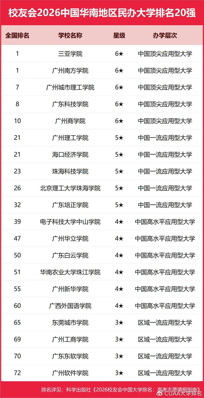 三亚学院、广州南方学院2026中国华南地区民办大学排名并列第一