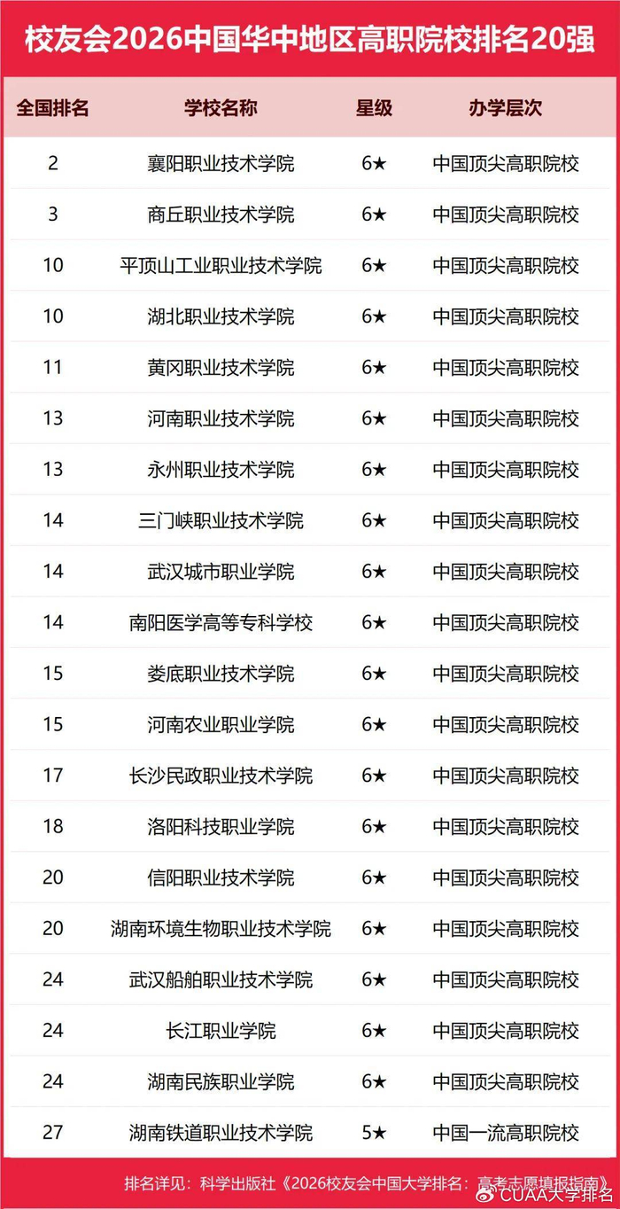 襄阳职业技术学院问鼎2026中国华中地区高职院校排名冠军