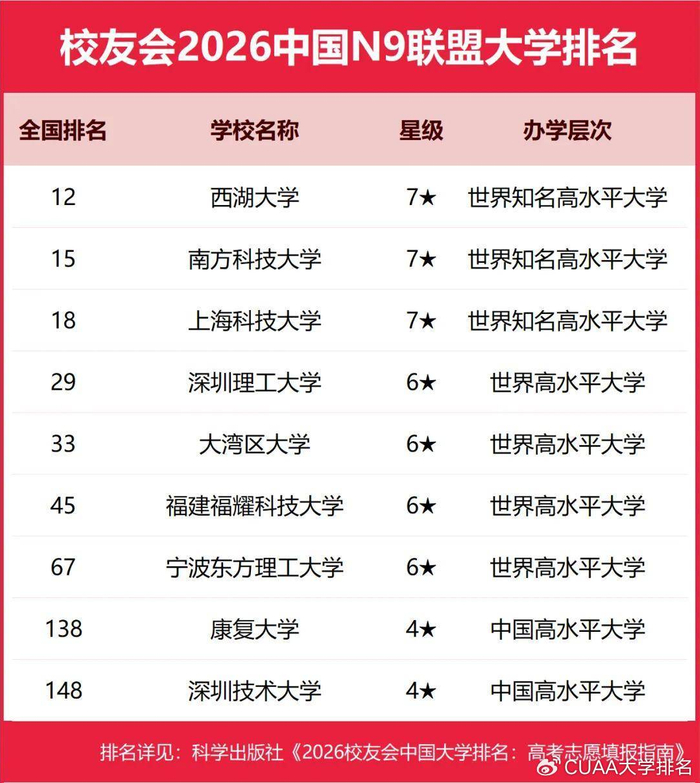 2026年1月12日,全国第三方大学评价机构艾瑞深校友会网(Cuaa.net)撰写完成、科学出版社即将出版发行的《2026校友会中国大学排名:高考志愿填报指南》最新公布校友会2026中国N9联盟大学排名。榜单显示,西湖大学与C9高校并驾齐驱挺进全国12强,雄居校友会2026中国N9联盟大学排名榜首,刷新了中国新型研究型大学排名的最高纪录。南方科技大学、上海科技大学、深圳理工大学表现突出,挺进全国30强。